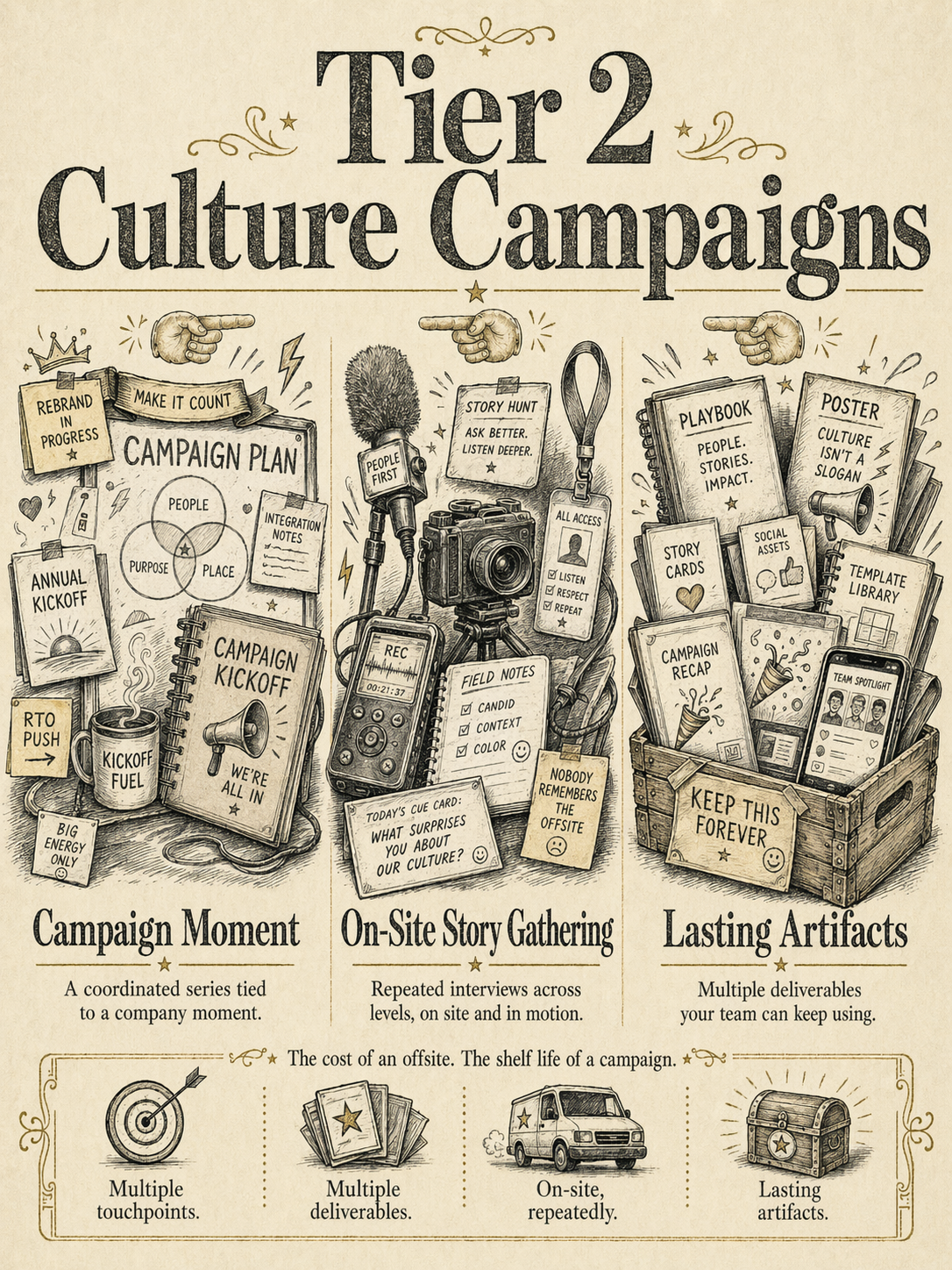 Multiple touchpoints, multiple deliverables. We're on-site repeatedly, interviewing across levels, functioning as your outsourced culture-and-creative team.