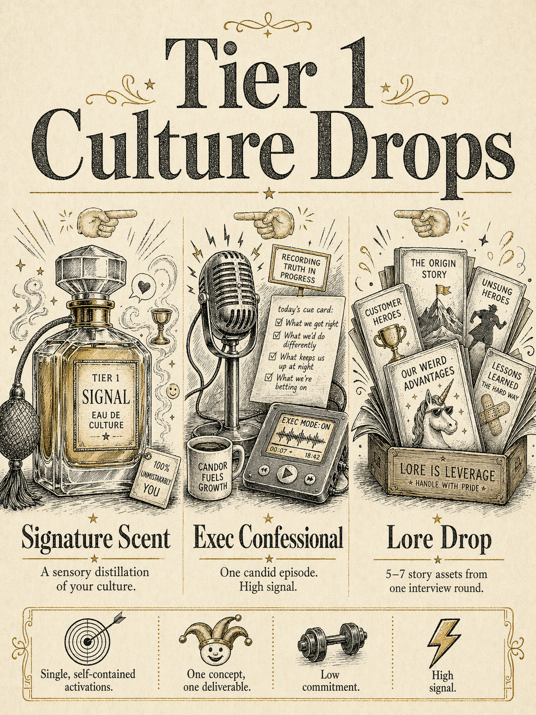 It can be a Signature Scent, an Exec Confessional episode, a Lore Drop of 5–7 internal stories from one round of interviews, or a full quarter-long campaign tied to a company moment.