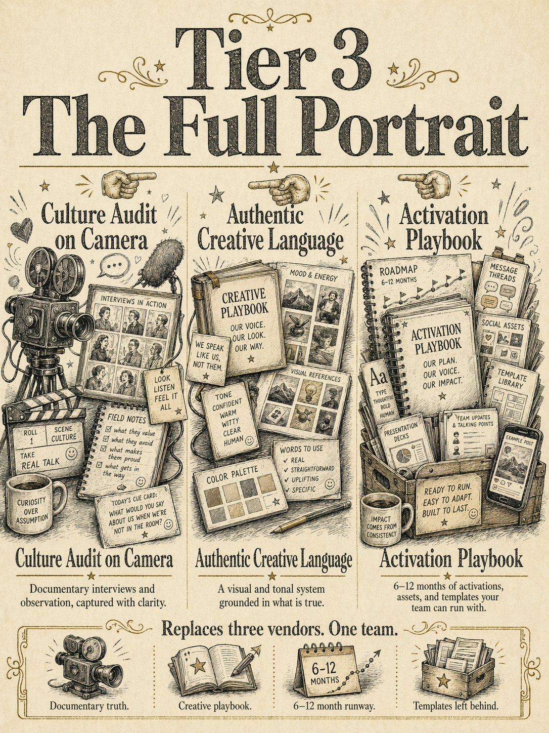 Tier 1 is 4–6 weeks with one deliverable. Tier 2 is a full quarter of coordinated touchpoints. Tier 3 is 2–3 months embedded with a documentary and a 6–12 month playbook.